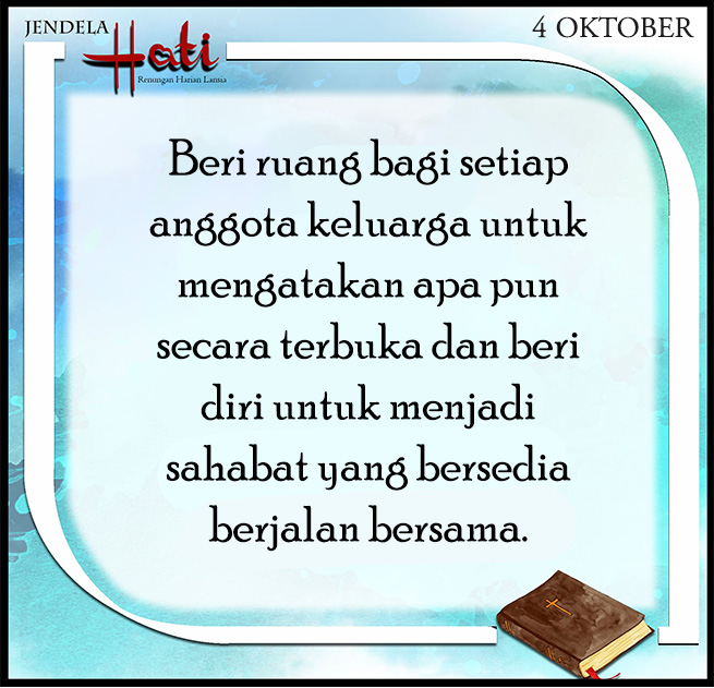 Kadang-kadang anak-anak menyimpan persoalannya dan mengkondisikan keadaan seakan-akan baik-baik saja. Namun, sesungguhnya setiap pergumulan yang ditanggung bersama akan jauh lebih ringan. Kebohongan tidak akan memberi hasil yang baik juga dalam kehidupan berkeluarga. Marilah kita membuka ruang bagi setiap orang agar dapat mengatakan apa pun secara terbuka dan memberi diri untuk menjadi sahabat yang bersedia berjalan bersama. Kita sebagai orangtua pun diberi hikmat untuk bersama-sama saling menguatkan dalam hidup berkeluarga.