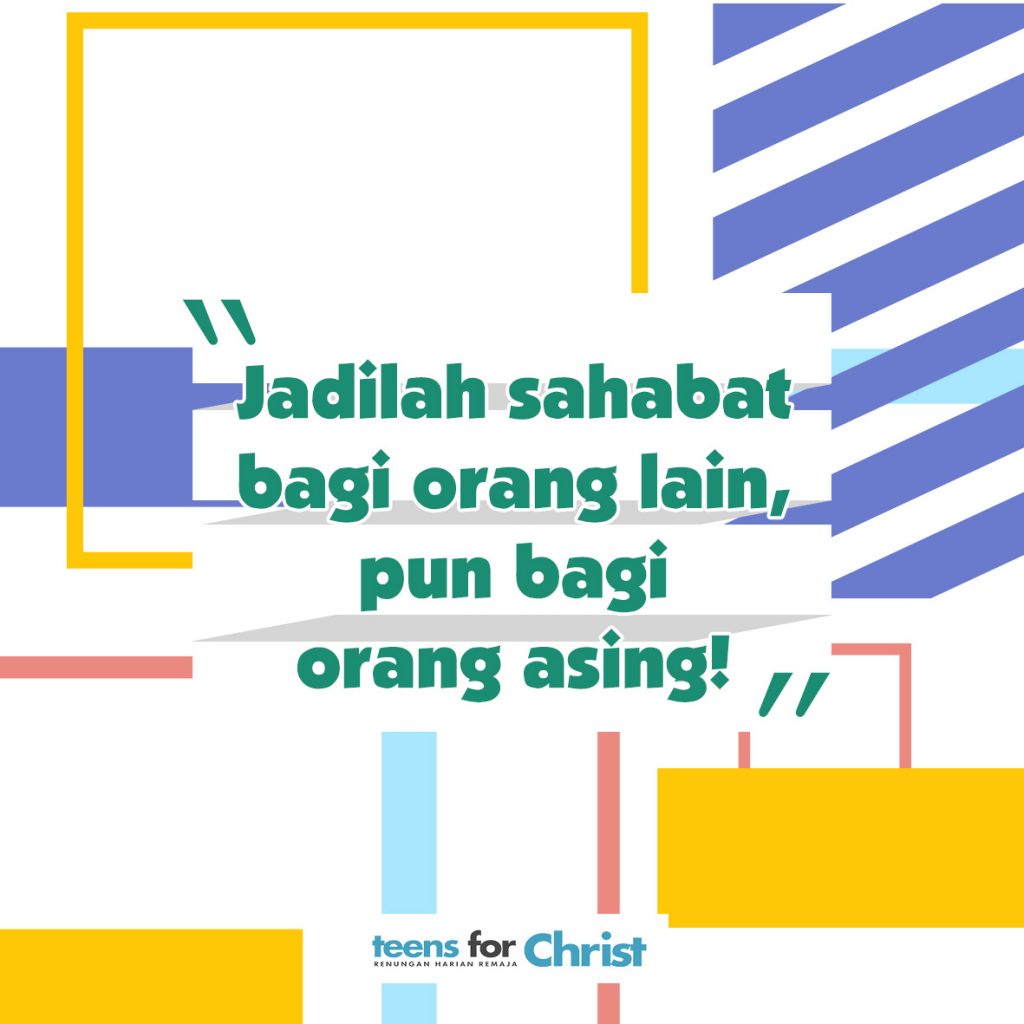 Teens, Elisabeth Kubler-Ross, seorang psikiater ternama mengatakan bahwa kehilangan orang yang dikasihi dan beradaptasi dengan lingkungan baru adalah dua momen krisis yang dialami manusia. Sungguh tidak mudah menjadi seorang asing yang tak dikenal di dalam sebuah komunitas yang baru. Dalam komunitas, jika ada anggota baru, hadirlah sebagai sahabat yang bersedia menyambut. Hadirkanlah di sana keramahan dan kasih persaudaraan. Menjadi sahabat yang ramah bagi orang asing juga dapat dilakukan dalam pelayanan di gereja. Misalnya, menjadi ushers dan greeters dalam kebaktian Minggu atau persekutuan remaja.